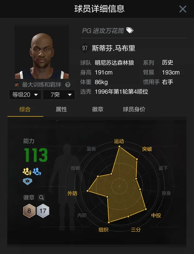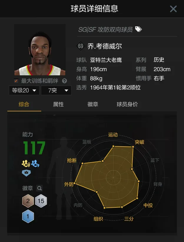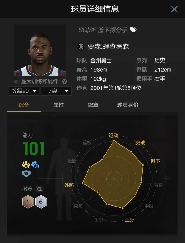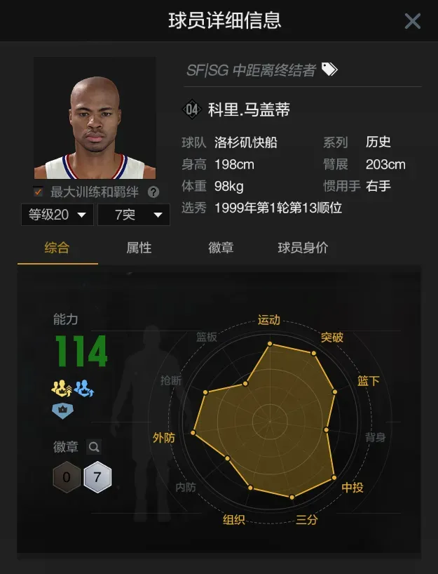 第五位科里马盖蒂,游戏满突身价两千万多点,突扣过线,投射表现不错,不过徽章质量相对一般,防守也只能用合格二字形容。