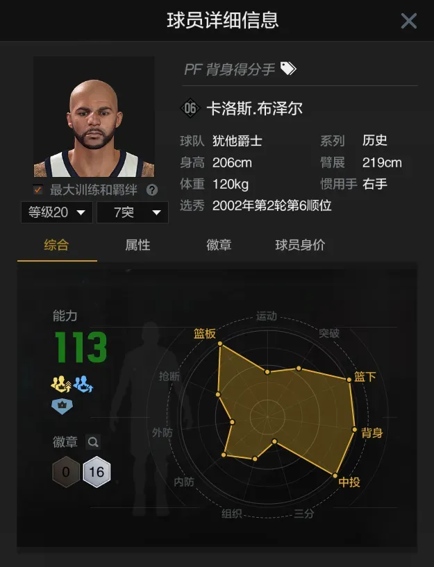 第七位卡洛斯布泽尔,当前满突身价五百万左右,二内定位,中距离投射稳定,解锁双篮板动画,不过速度偏慢,防守也相对一般。