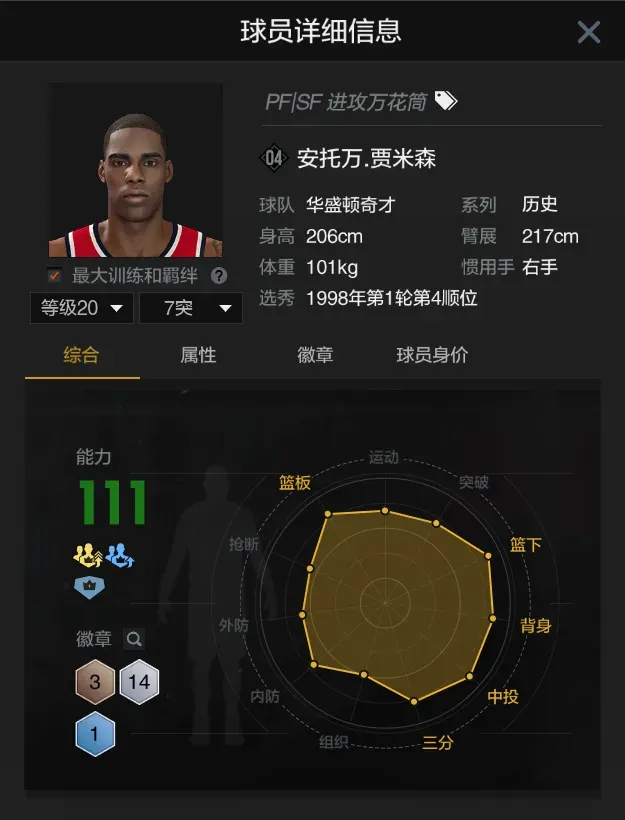 第六位安托万贾米森,早期游戏里不错的空间型大个,只可惜引擎升级后投篮包速度偏慢,自身的防守表现也比较一般。