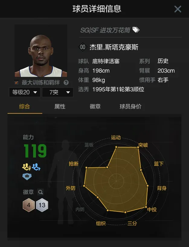 第三位杰里斯塔克豪斯,满突身价两千多万,进攻能力还不错的侧翼球员,突扣轻松过线,体力足,只不过防守端表现一般。