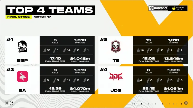 梅花桩,JDG进攻QAD,将后者团灭,随后JDG又打掉BGP一人,随后向上发动进攻,但是BGP-Gyuyeon依靠地形优势,打掉JDG两人,最后与Dec12th1V1,Gyuyeon依靠P90枪械优势完成吃鸡。