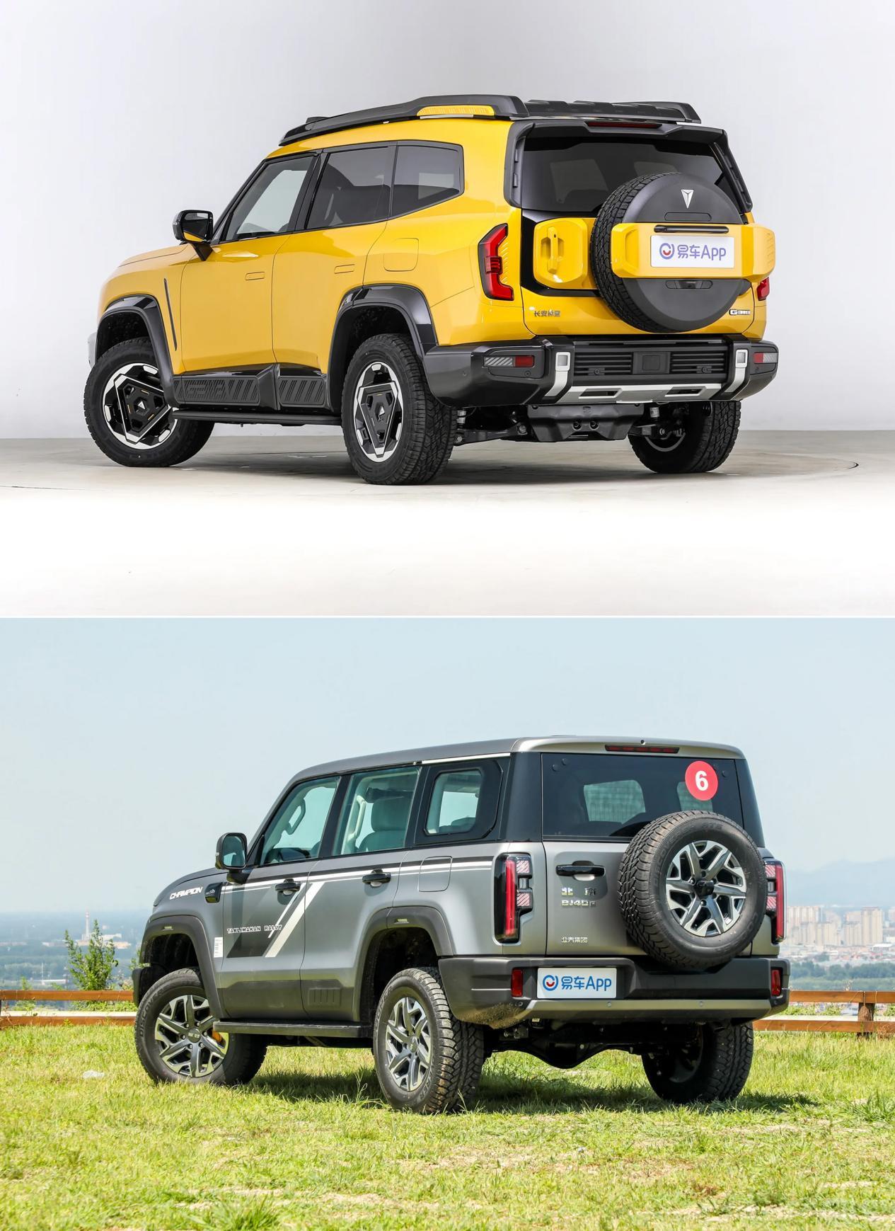 深蓝G318无忧穿越版的硬派机能车尾每一处设计都彰显着极致的硬实力与实用性,环绕式尾翼,兼顾空气动力学与赛博美学,以切削线条与警示灯动效灯光相互融合,拥有更为大气的视觉观感,同时还提升了功能性与安全性,穿行之间,犹如电光交汇,绝美闪耀。深蓝G318无忧穿越版还采用了行业首创的单摇臂式备胎罩设计,以动感时尚的姿态完美契合其年轻活力的定位,下旋式快拆设计,轻松应对户外各种复杂环境。BJ40的车尾虽然没有深蓝G318无忧穿越版那般看起来潮流,但是浓重的传统越野风格也能给人带来一种可靠、踏实的感觉。