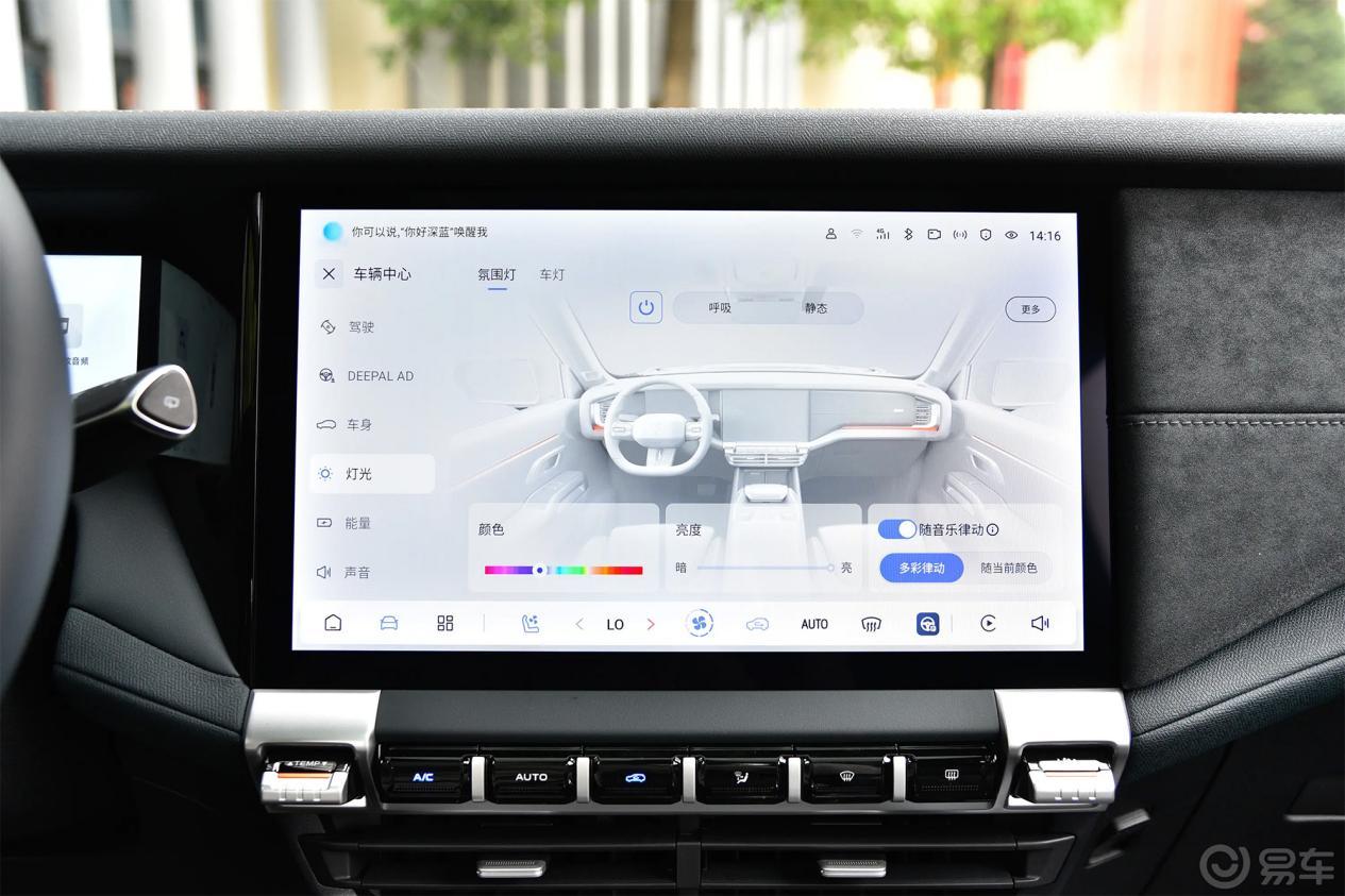 灯光方面是深蓝G318无忧穿越版的一大特点,前脸采用一体式贯穿科技风灯带,54颗灯珠三段式贯穿灯连通左右C型大灯、警示灯及LOGO灯,共同组成高能矩阵前灯组,点亮时高能绽放,未来科技感十足,同时也提升了夜间行车安全性与辨识度。同时,深蓝G318无忧穿越版还是行业唯一在售可行驶开启车顶远光灯,4个灯组里有2个远光辅助灯加2个露营灯,不仅看着越野味道更浓,照明能力也是比一般车更强。