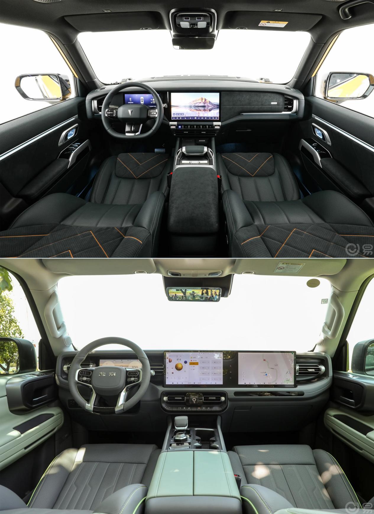 深蓝G318无忧穿越版采用圣湖绿高级内饰,座椅及门板大面积采用细腻的类麂皮绒面材质,触感柔软亲肤,营造出低调奢华的氛围,彰显品质感。深蓝G318无忧穿越版车内还配有覆盖车内全区域的环绕式氛围灯设计,支持音乐律动、呼吸律动、开门迎宾等多种智能交互场景,打造沉浸式的灯光体验。同时,16高品质扬声器配上无麦K歌功能,再加上联动座舱氛围灯,打造私享K歌房,打造自由自在的嗨歌沉浸体验。BJ40的内饰则偏向硬朗风格,中控台线条粗犷,整体延续实用主义,营造出一种硬派与舒适并存的氛围。同时,副驾驶还配有一块12.8英寸的液晶屏,副驾的娱乐性体验会更好一些。