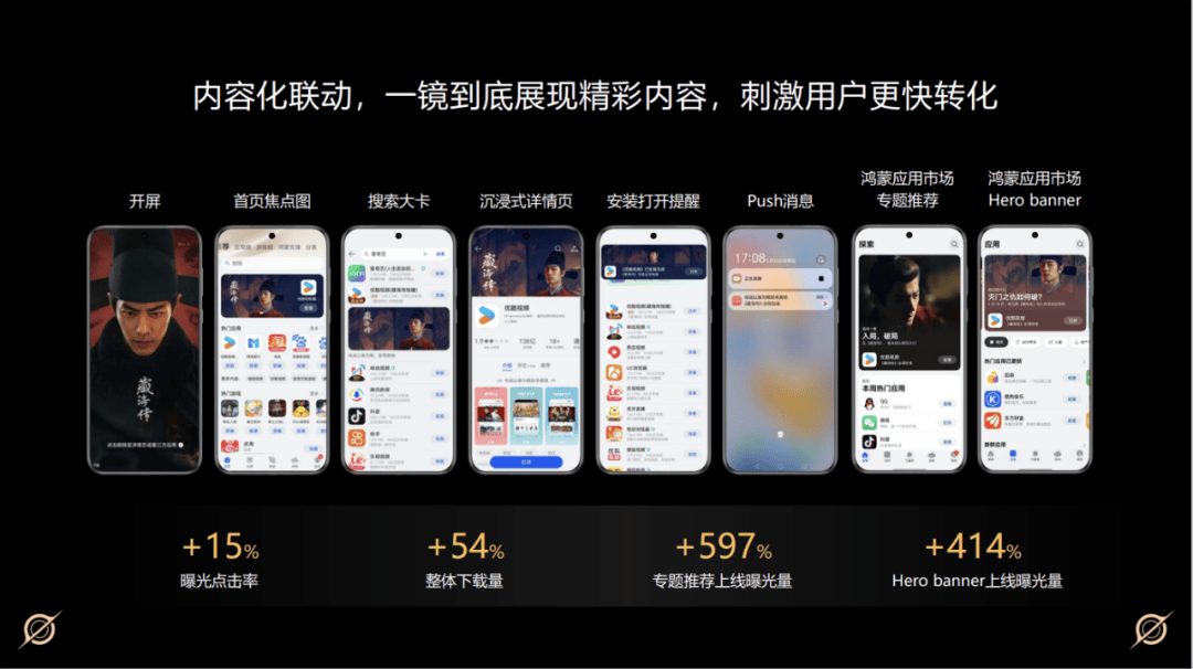 比如优酷视频会利用内容联动的模式,不再直推App,而是以当季热剧作为物料,「一镜到底」地串起从开屏到搜索、从推荐页到Push消息、从焦点图到详情页的全链路,最终实现了下载量这个核心指标大涨54%的结果。
