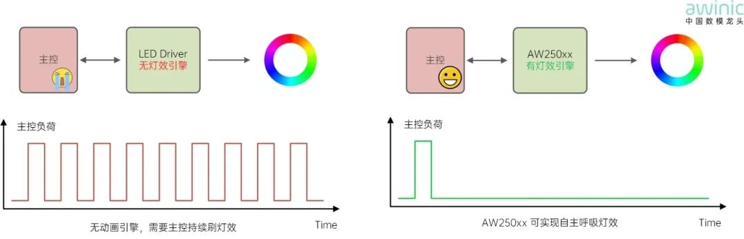 家电、AIoT、手机等智能终端设备持续打造极致性能,其主控需要优先处理高优先级任务,通常难以兼顾实时刷动画灯效。AW25036 系列内置智能动画引擎,可自动实现呼吸灯效,无需主控控制,节省主控资源、降低系统功耗,同时灯效更加平滑细腻。