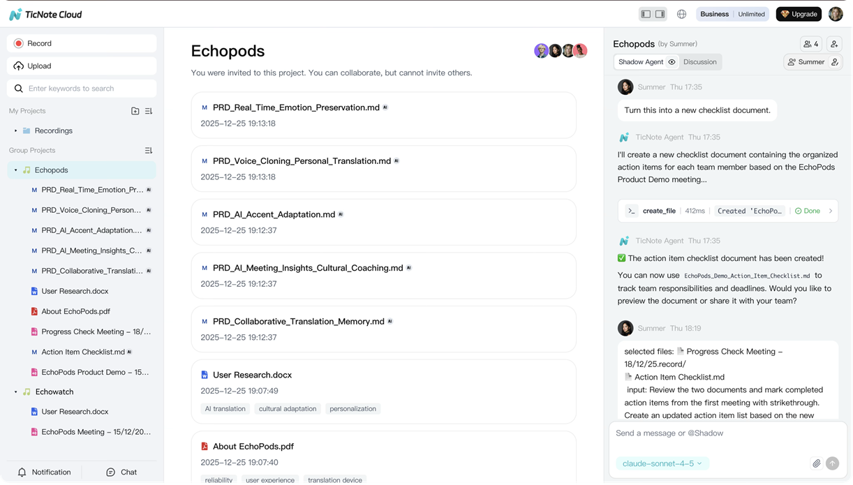 对于TicNote Cloud上创建的每一个项目,用户可以自由组建团队,进行讨论决策。Agent基于项目感知和指令,对文件进行操作,每一个想法的迸发、每一次的文件修改,都能实时同步给其他成员。